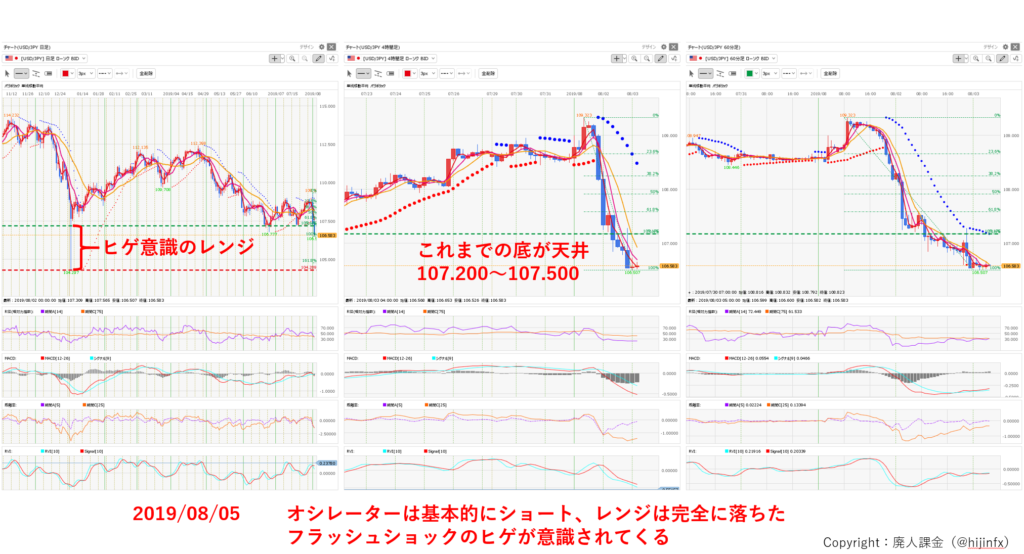 様々な円高要因となる材料が重なり、上昇しては下げるを繰り返し 106.8 付近をかろうじてこらえていたもののそのラインも掘ってしまった結果となります。