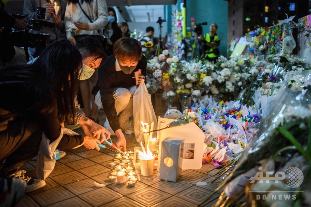 【11月9日 AFP】香港で起きた警官とデモ隊との衝突現場で学生が転落死したことを受け、同市で8日夜、追悼集会が行われ、数千人が参加した。学生の死を受け、民主化運動側からは怒りの声が上がり、市内では新たな騒乱が起きた。