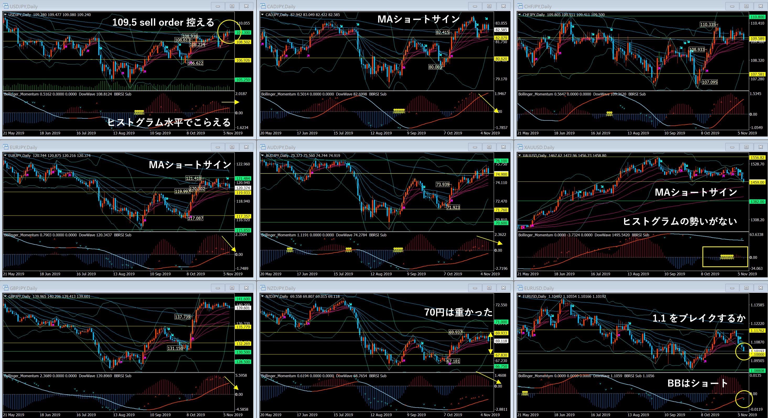 特にドル円は 109.3 でこらえていますが、若干ピンバー気味の方向感が定まらないプライスアクションになっていると思います。MAではまだ上昇トレンド。他クロスペアが下げ始めていることが懸念になります。