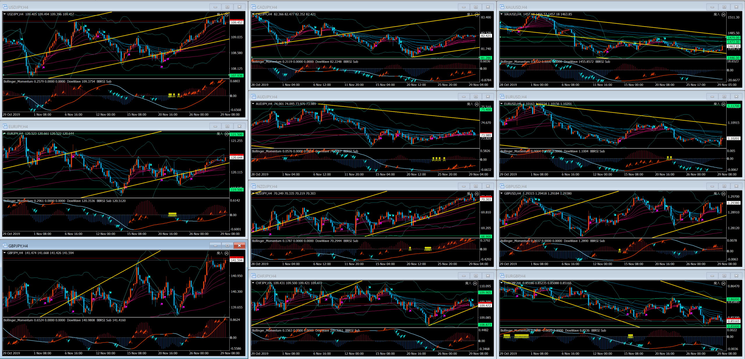 新しいペアを挿入し、トレンドラインとしてピッチフォークを黄色でひきました。MA長期を突破しそうなもの、突破出来なそうなものを基準に廃人課金の目線となります、ご容赦ください。
