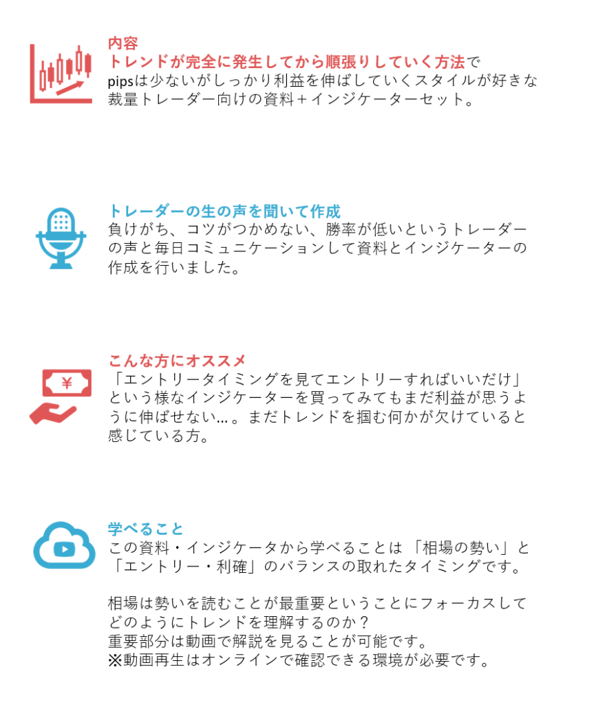 インジケーター枠で出品しておりますが、PDF資料内容がメインでその濃さと解りやすさが売りです。自分の裁量トレードを育てる人向けなので、動画で全てを解説しております。