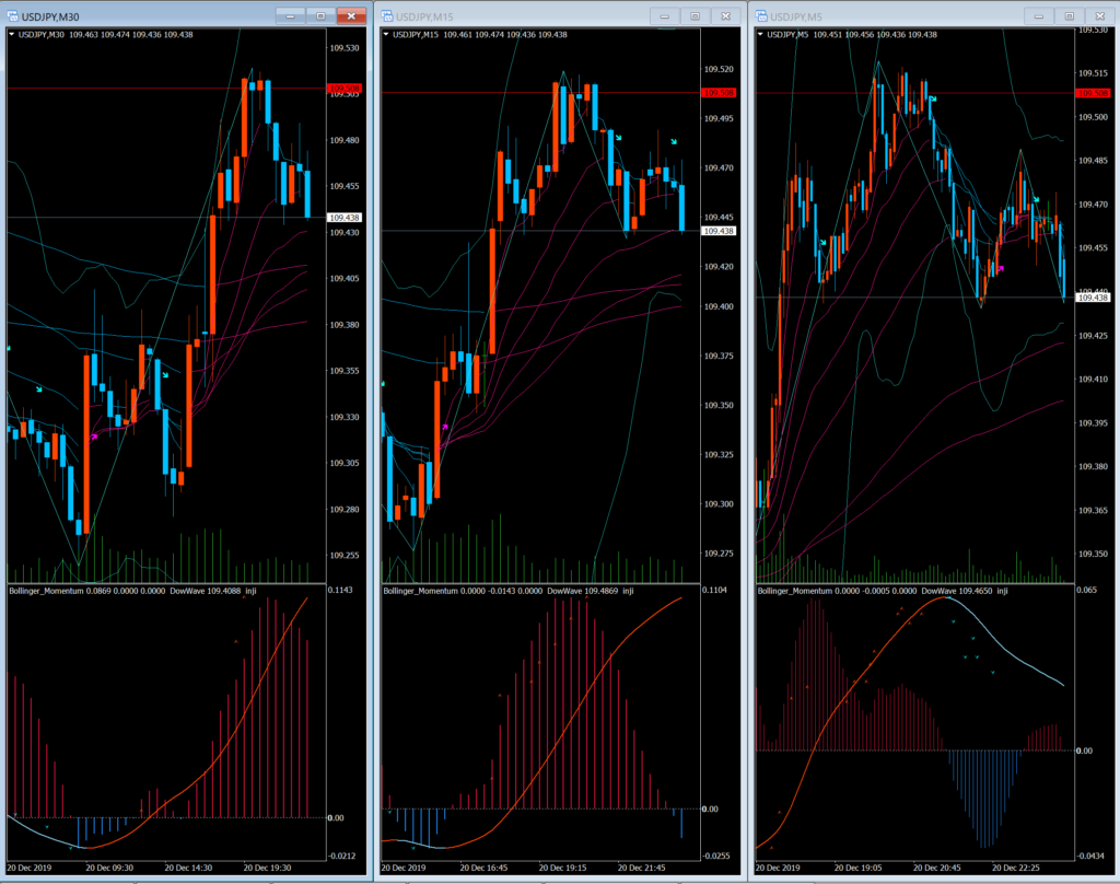 このような強くトレンドが発生している相場を見極めることが非常に重要だと言えます。1分足だけしか見ないトレードは非合理的なのでリアルタイムでトレードするのであれば上図のように、15~1分を並べてトレンドの同期性を見ると勝率が変わってくるはずです。