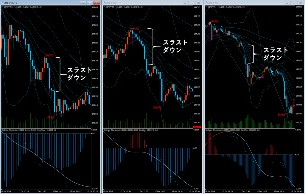 2019.12.17 のポンド円からスラスト(直前足の高安値を更新して実体が形成されるアクション)の部分を抽出しました。15分~1分の同じ時間軸(高値・安値をフラグを参考)でスラスト部分を見てください。
