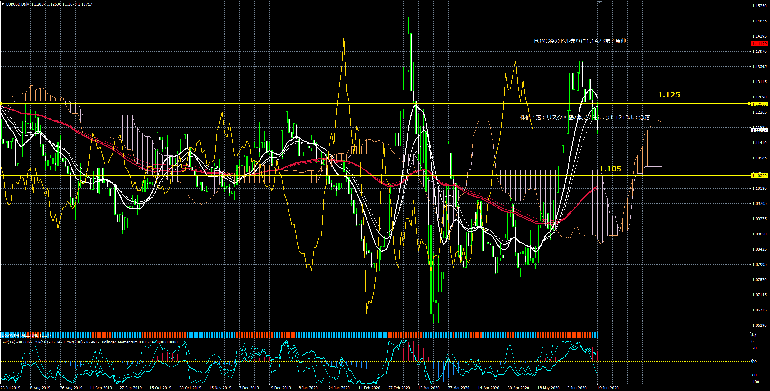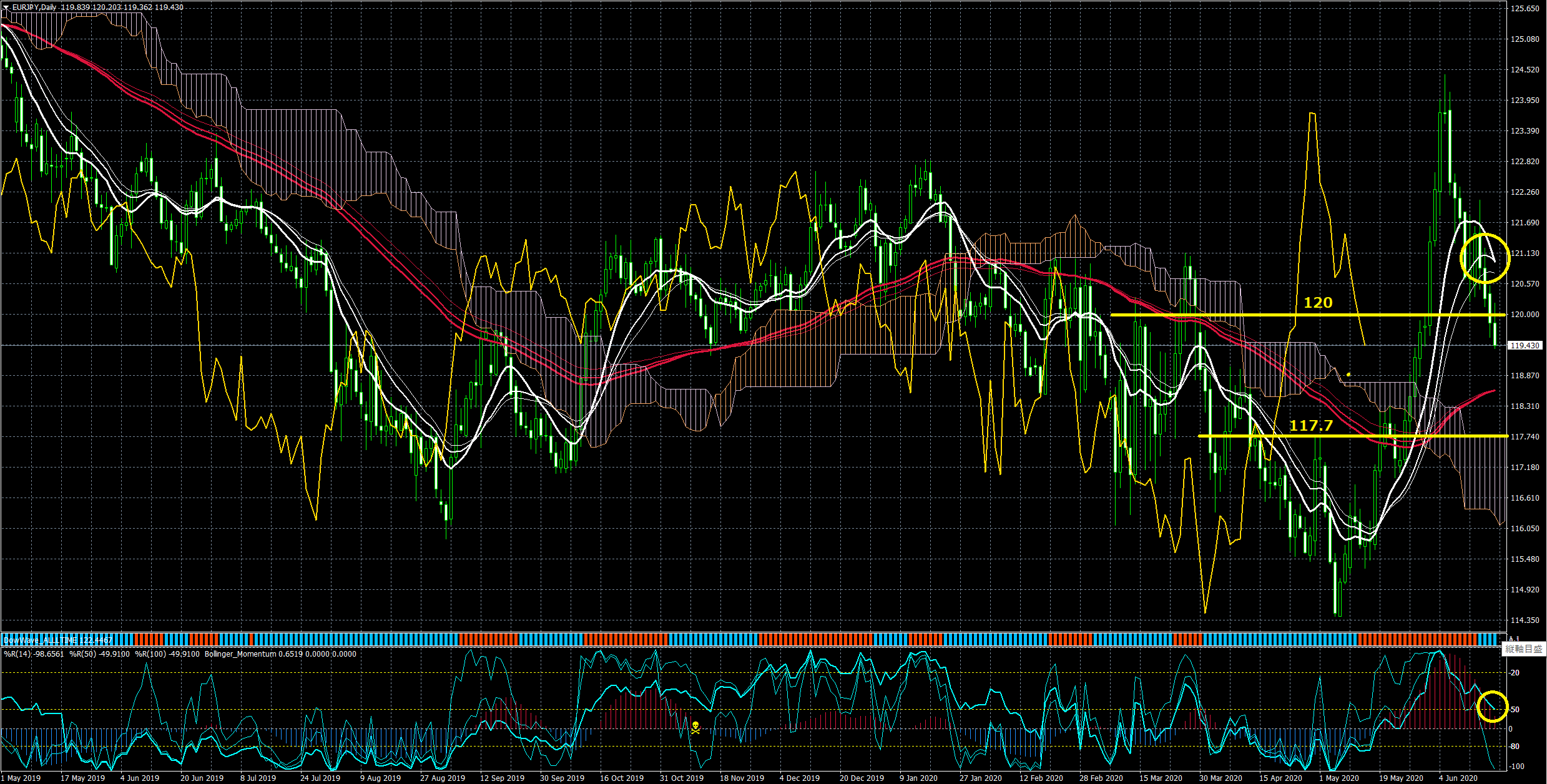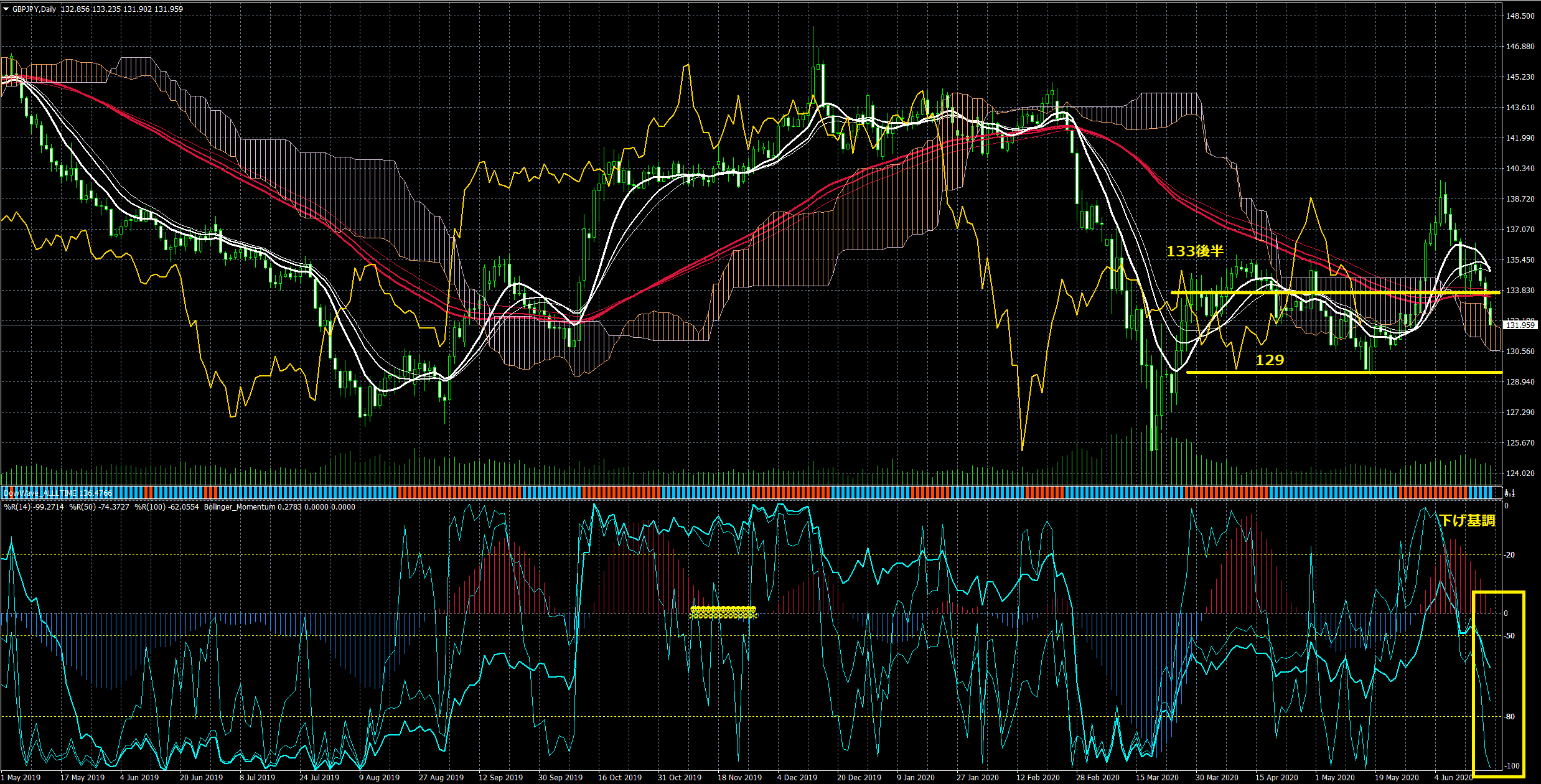 Williams%Rh一旦下降シグナル。4時間足は雲にも入っていることからテクニカル的には弱気と考えます。