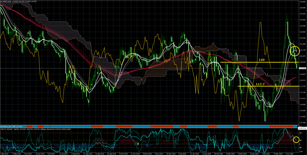 日足はこらえて、下位足4時間以下が下げ。節目 120円も近いちょっと方向感が難しいという所から下が 119円、上123円をまずは見ていきたい。
