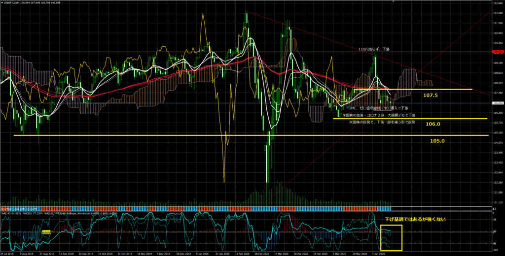 下落リスクの多い状態なので、上値が重く 108円台の下限が105.5円ぐらいかと見ております。 06/17 石油在庫統計があるので米国株価への良い影響があるのか?に注目したいですね、また06/18 はフィラデルフィア連銀景況指数もあるので週の後半から様子が変わるのか、注目しております。