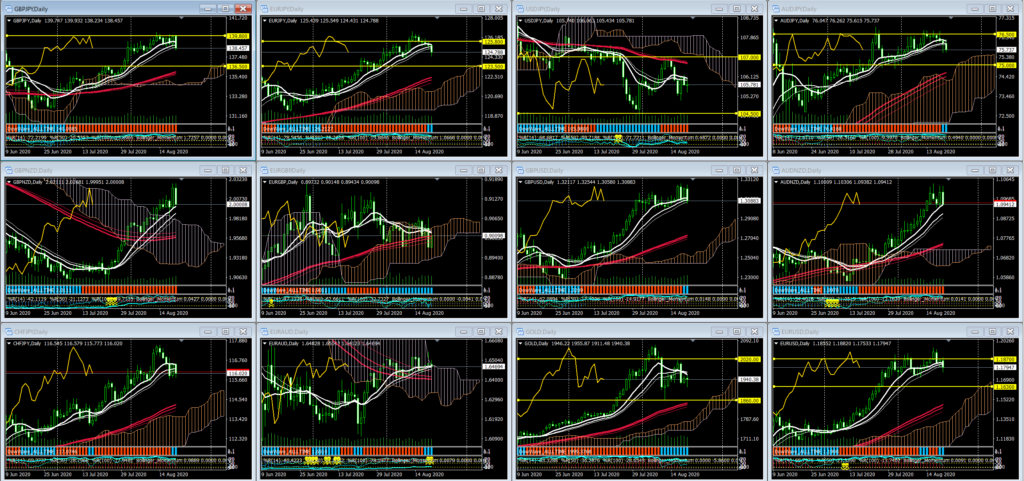 ドル円はリスクオフが懸念され、米株は順調に上昇している。08/24週はいよいよジャクソンホール(08/27)を控える週になり、金利政策について注目が集まる。米国選挙や中国との対立(コロナ・貿易・香港など)のファンダメンタルズの材料がほぼ解消されないまま金融マーケットは一喜一憂している状態が続いている。