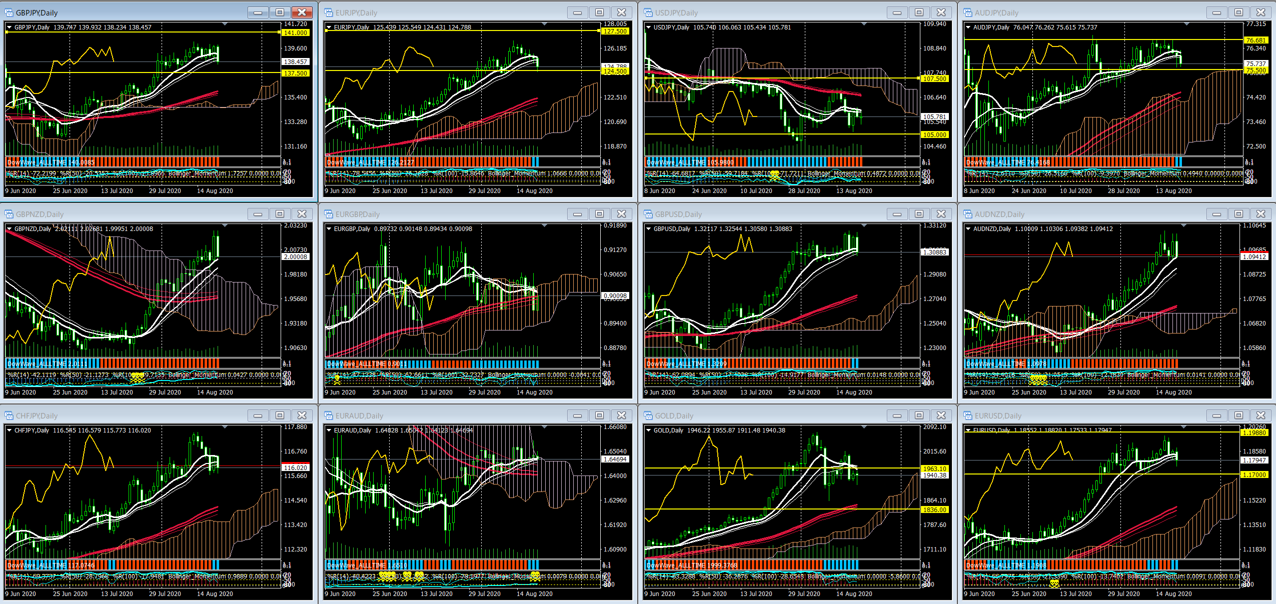 ドル円はリスクオフが懸念され、米株は順調に上昇している。08/24週はいよいよジャクソンホール(08/27)を控える週になり、金利政策について注目が集まる。米国選挙や中国との対立(コロナ・貿易・香港など)のファンダメンタルズの材料がほぼ解消されないまま金融マーケットは一喜一憂している状態が続いている。