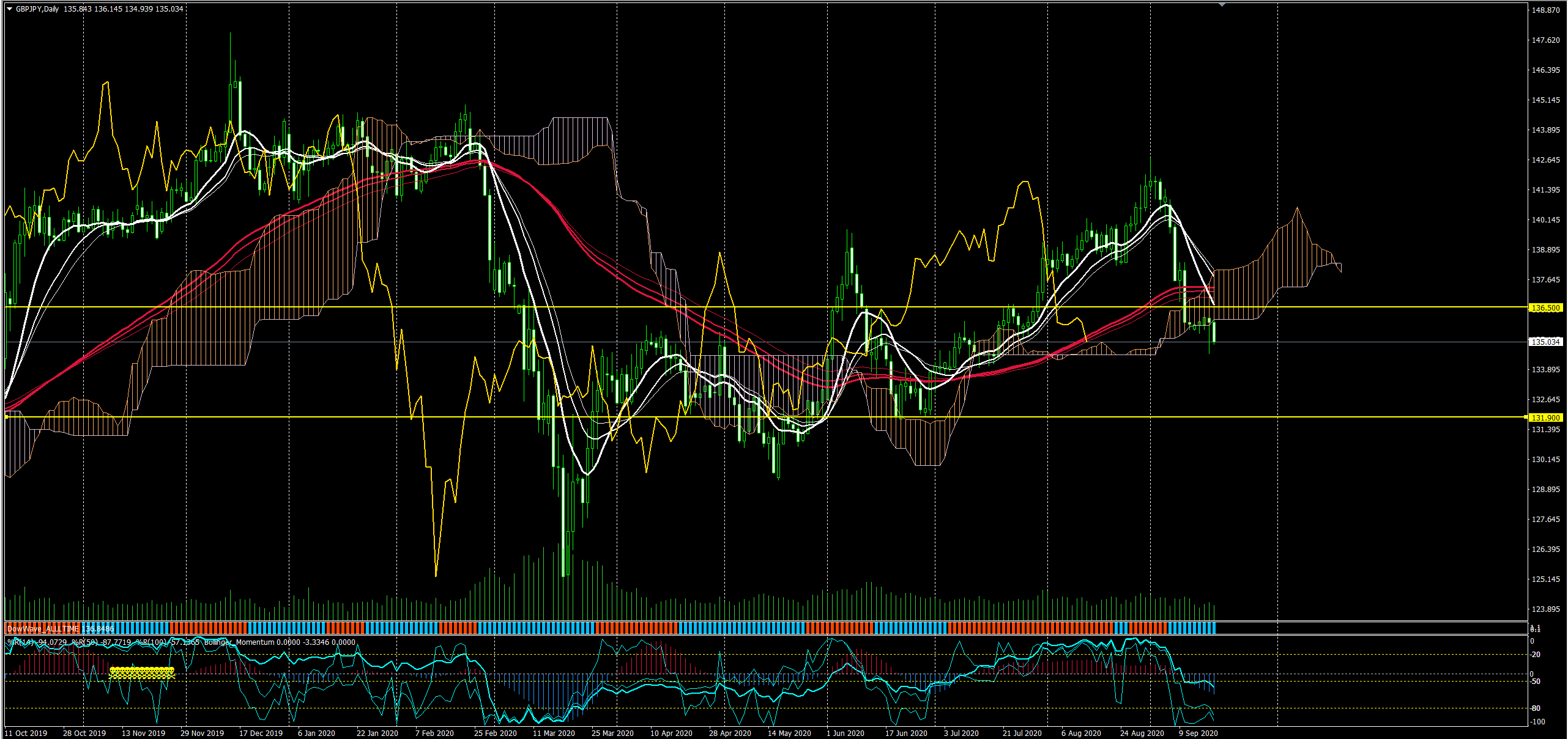3週間前に引いたライン(黄色)から大きく乖離した通貨は「ポンド円」、EUとの通商交渉関連でリスクオフムード。全体としても円高傾向、日本の総理後退や米中の悪化、米国大統領選挙などのファンダメンタルズから先週は一気に円高を加速させた一週間でした。