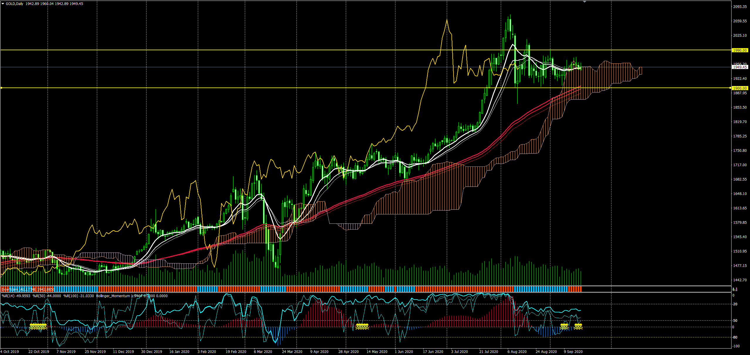 一目均衡表の雲まで突入。ここまでレンジでスクイーズされてきました。ボリンジャーバンドを表示させれば丁度センターです。長期目線ではロングなので大きく下げて 1900に近いほど拾っていきたい、lot を下げて今買うかちょっと悩みどころ。