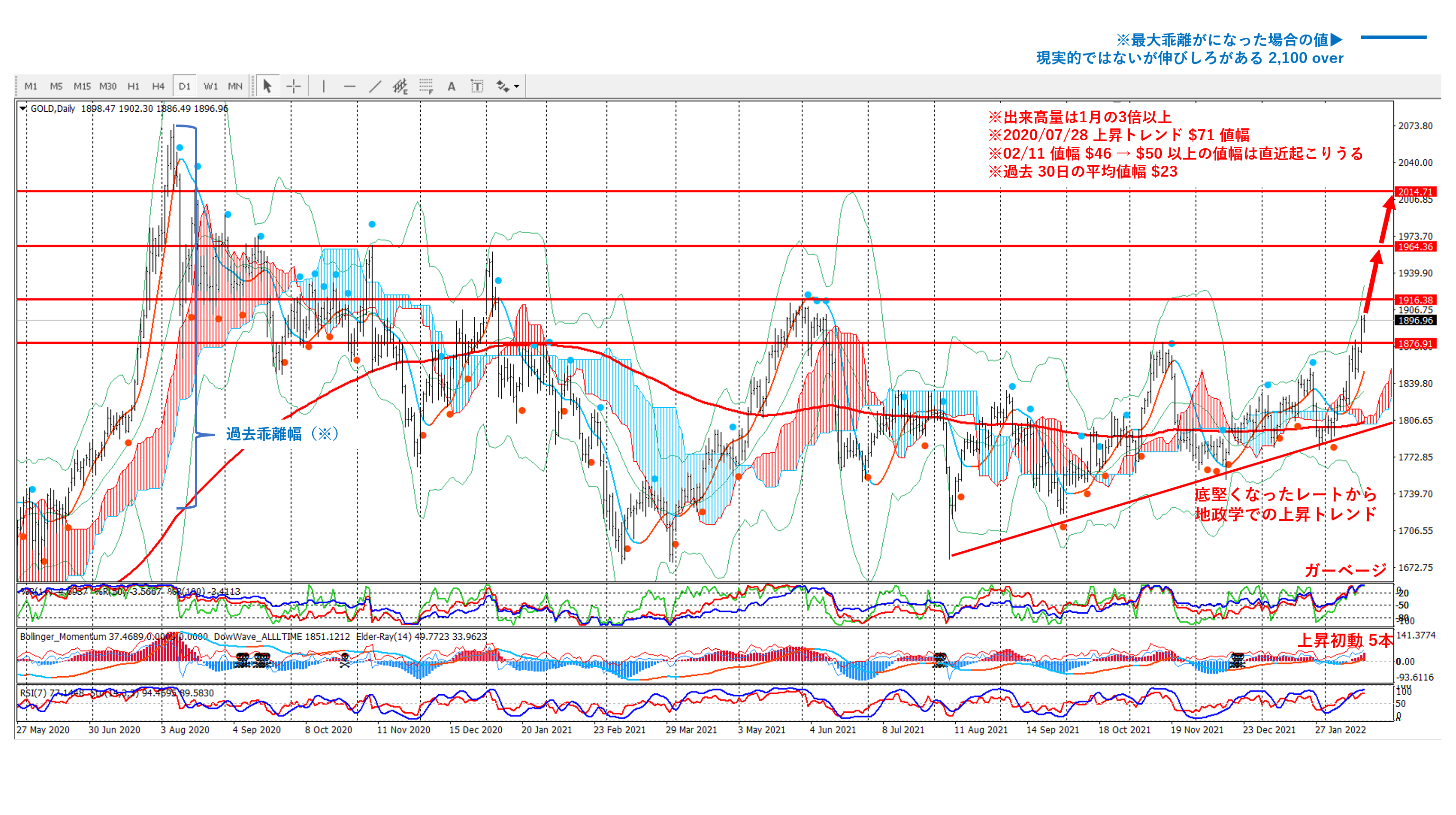 - 直近の金レートは底堅く推移していたので、上昇初動と見て良い。ただし、地政学的な上昇ブレイクになったので状況解消による下落を注意する必要があり、金利やその他経済バランスも考慮する。