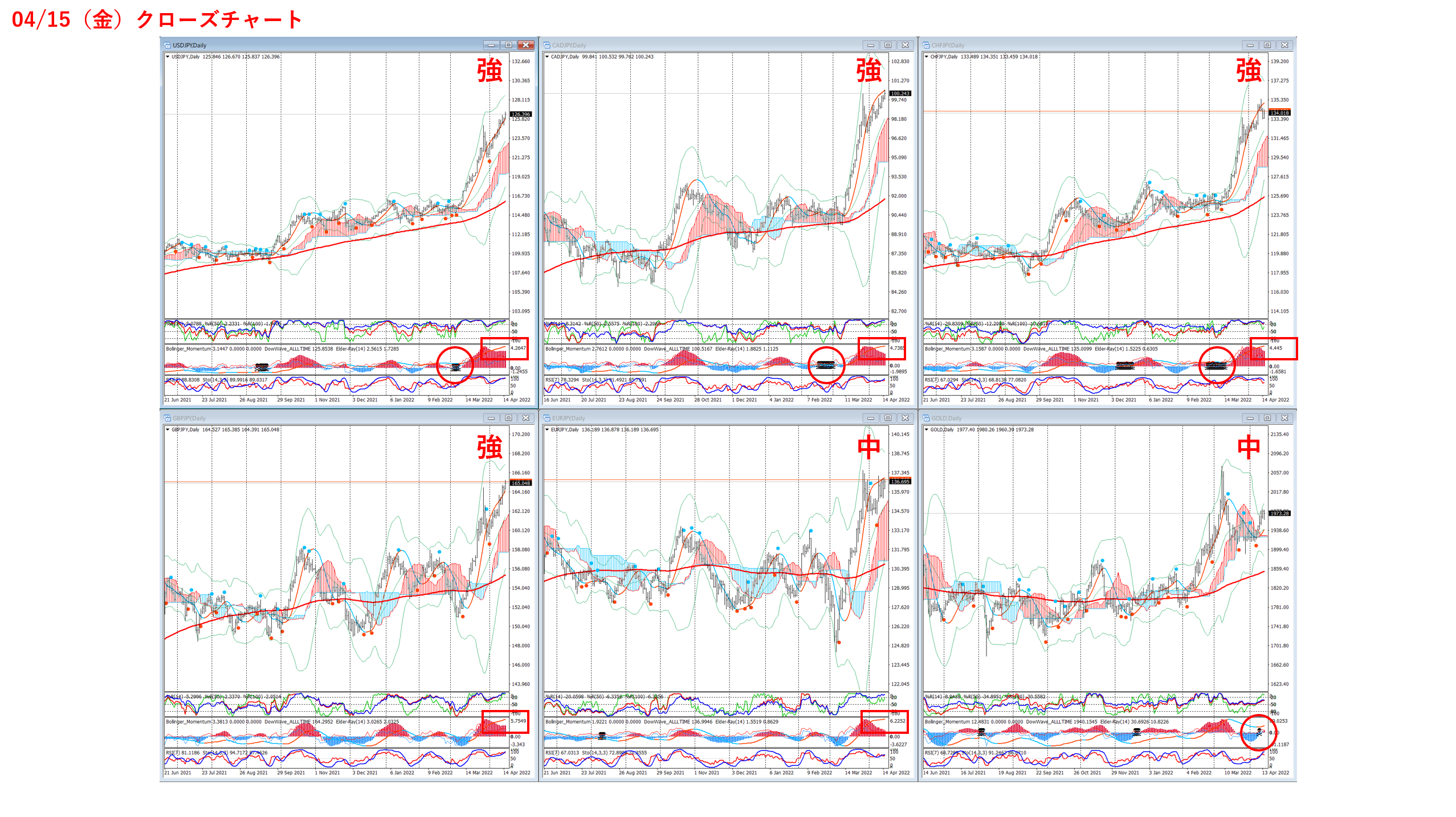 その中でも注目したいのは、USDJPY、CADJPY、CHFJPYです。この3つはBollinger_Momentaumでドクロが出現してからの上昇トレンドに入りましたので激アツになります。継続性として四角枠をつけましたがこのBollinger_Momentaumの減衰がストンと下に落ちていない(継続キープ)の可能性を秘めていることがわかります。この2つの根拠はかなり確度が高いと感じています。その他の環境としては、Williams%R も上昇ガーベージ、各種オシレーター、Dow_waveも上昇になっています。準じてGBPJPYも期待しております。