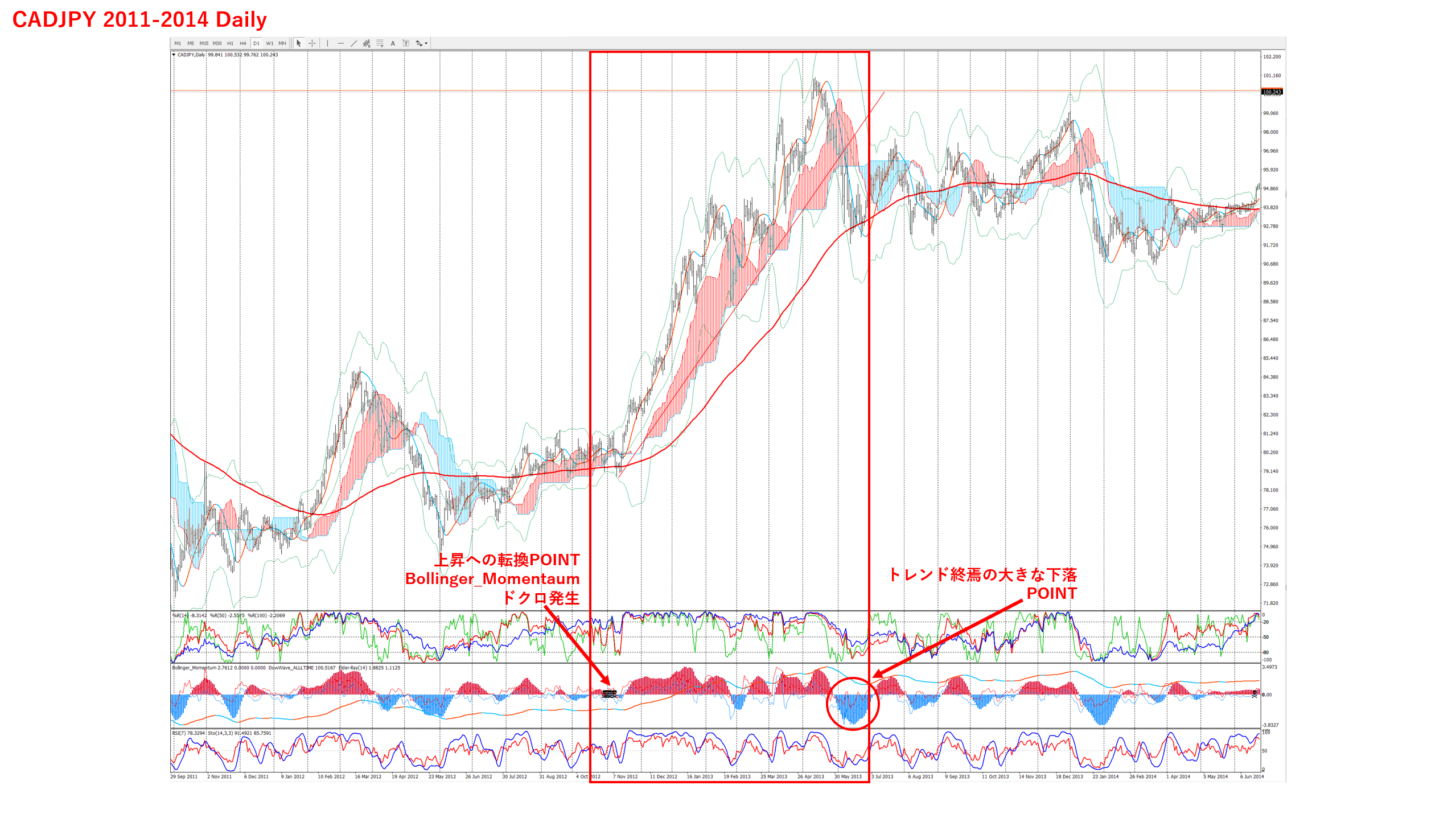 CADは資源として原油もあることから資源エネルギーの高騰背景からも強い上昇が期待できるのではないかと考えられます。トレンド上昇前のBollinger_Momentaumドクロ、終焉はヒストグラムが反転して大きな下落が終焉POINTとなりますので、現在のチャートを確認する限りではしばらくの間の上昇トレンド順張りが正解かと思います。