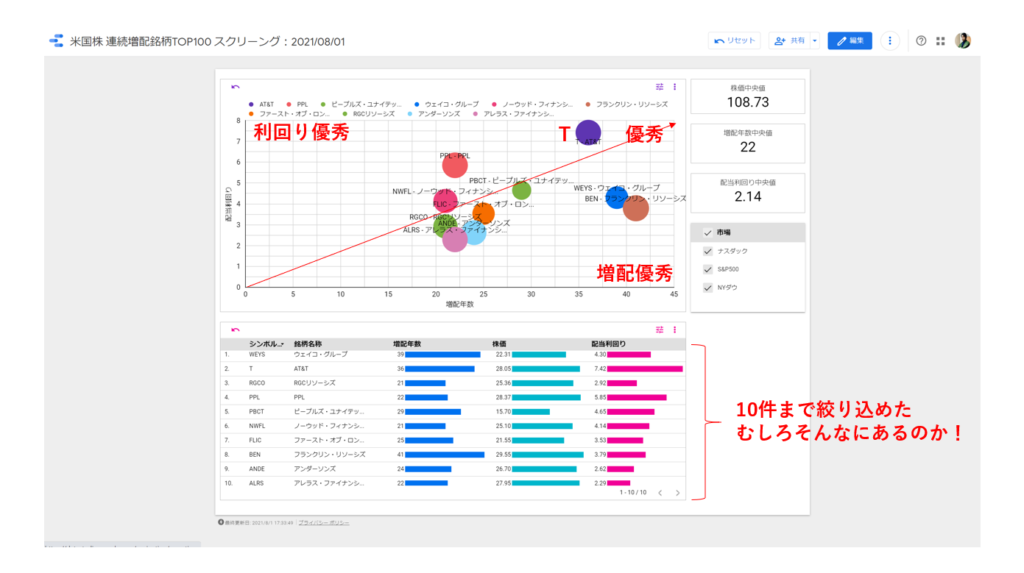 STEP 2 の最終的なバブルチャートを見てみると、利回りと増配年数の両軸で優秀なものが「AT&T」だ。他には「PPL」「WEYS」「BEN」などがあるので利回りなのか増配なのかどちらに軸を寄せて考えてみるといい。