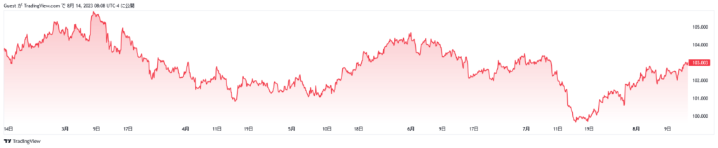 半年ぶりのブログでの定点観測。100が底値指数で、反発して08/14現在は 103となった。