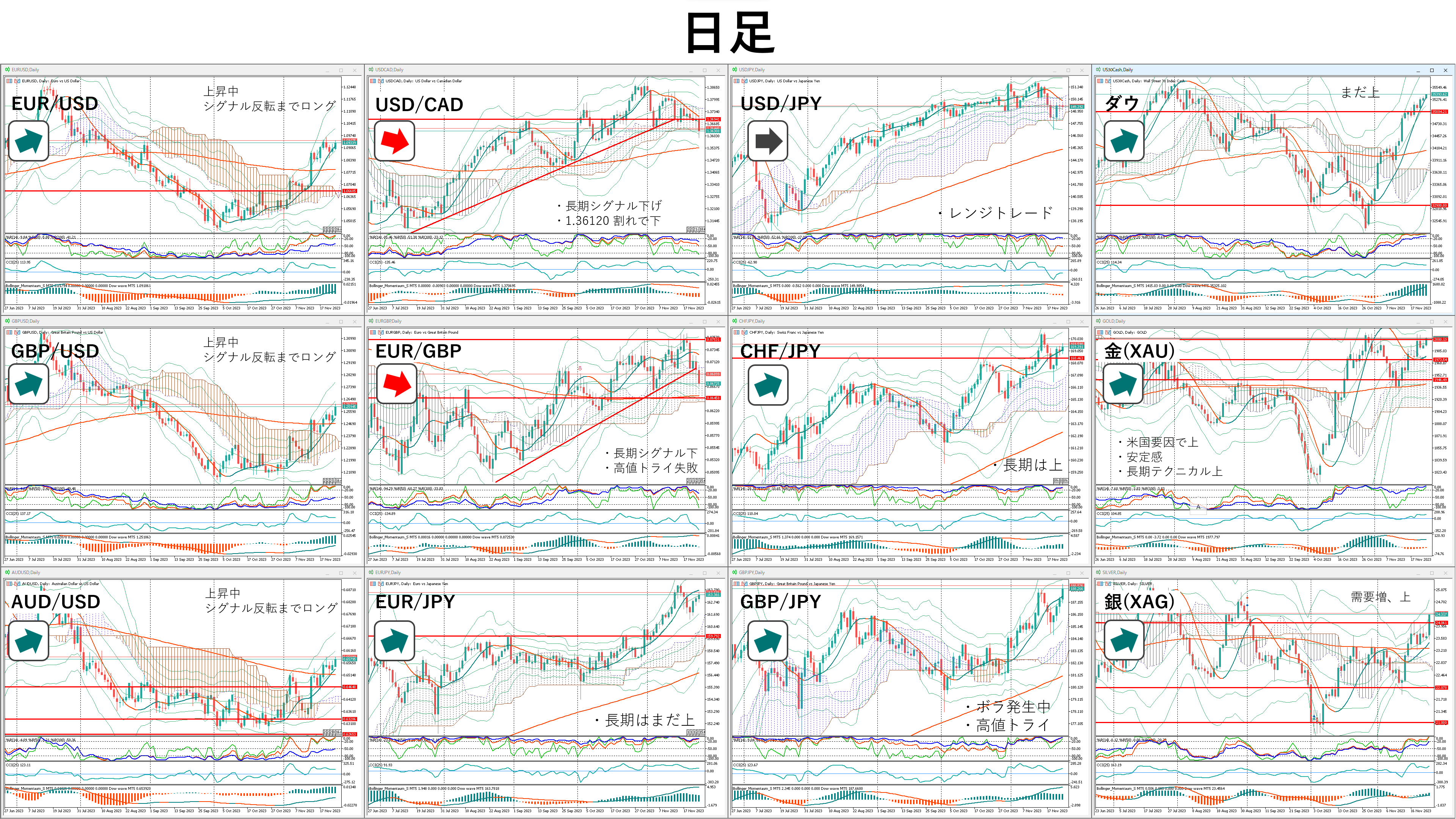 EURUSD,GBPUSD,AUDUSD,USDCAD,EURGBP,EURJPY,USDJPY,CHFJPY,GBPJPY,US30(Dow Jones),GOLD,SILVER(左上から)、有料インジケーターチャートで公開。