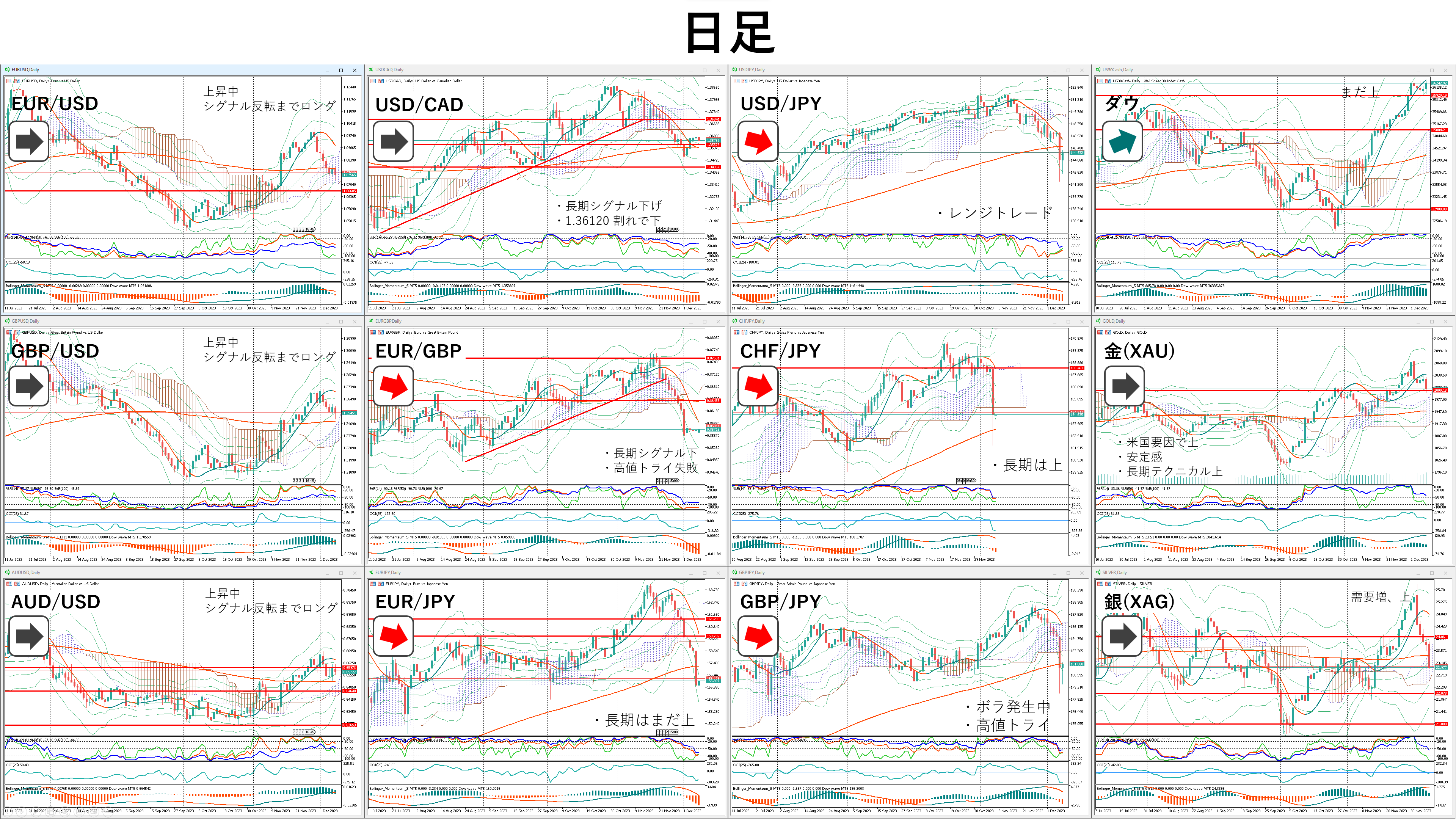 EURUSD,GBPUSD,AUDUSD,USDCAD,EURGBP,EURJPY,USDJPY,CHFJPY,GBPJPY,US30(Dow Jones),GOLD,SILVER(左上から)、有料インジケーターチャートで公開。